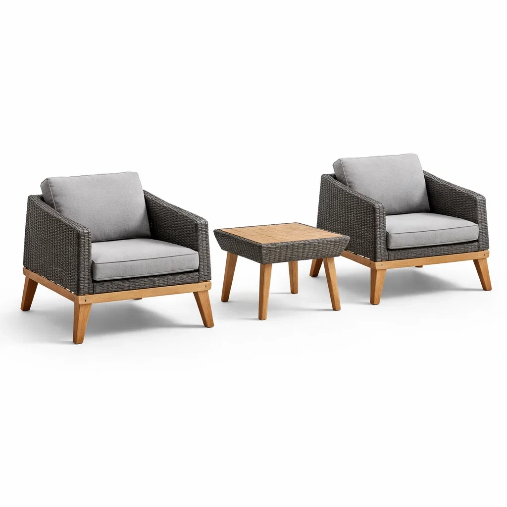 Ensemble de détente fauteuils et table en rotin gris avec accoudoirs en bois et coussin en tissu