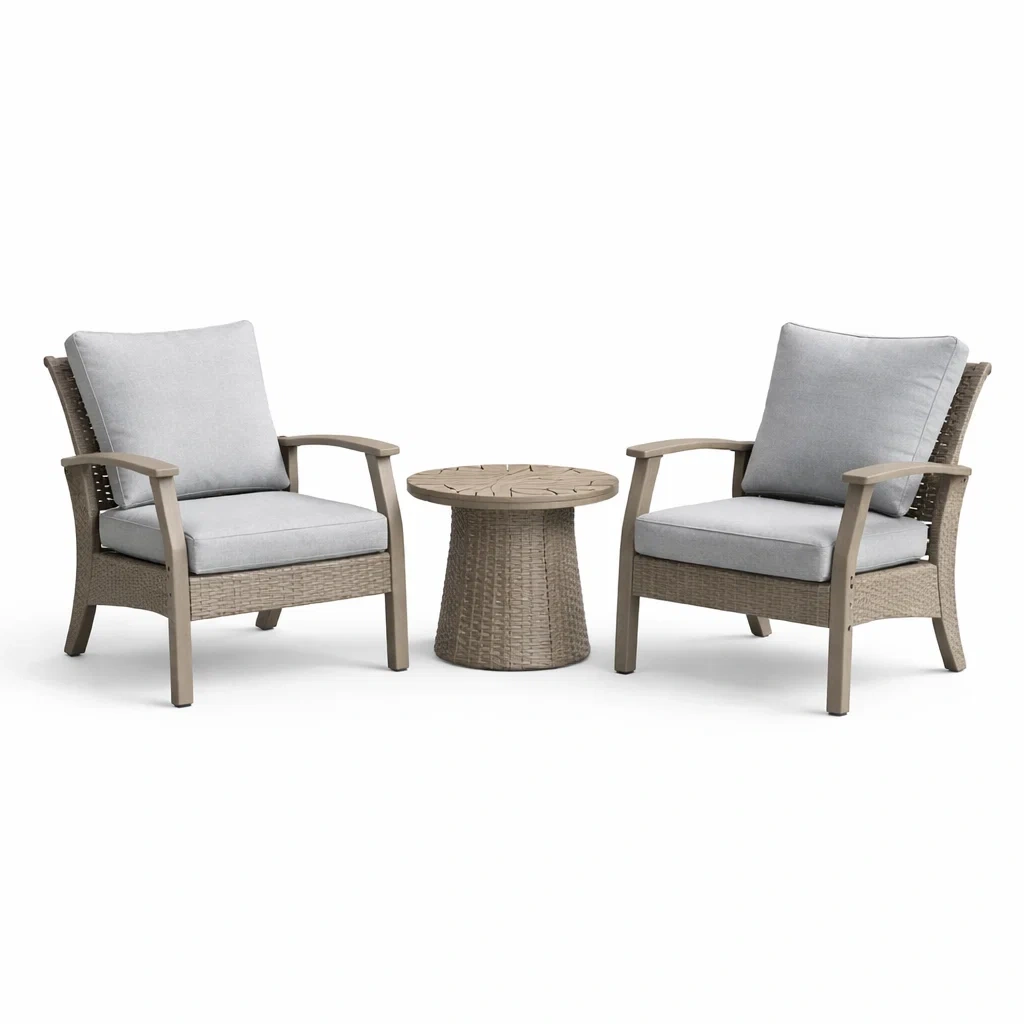 Ensemble de détente deux fauteuils et table basse en résine avec coussins en polyester gris